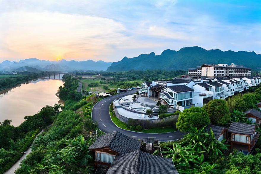 走进位于宁明县城中镇的花山温泉小镇,只见屋舍俨然,曲径通幽,竹影婆娑。举目四望,碧绿如黛的明江水源源不断地滋养着这片土地,山重水复,峰回路转,宛如一幅恬静的田园画卷。