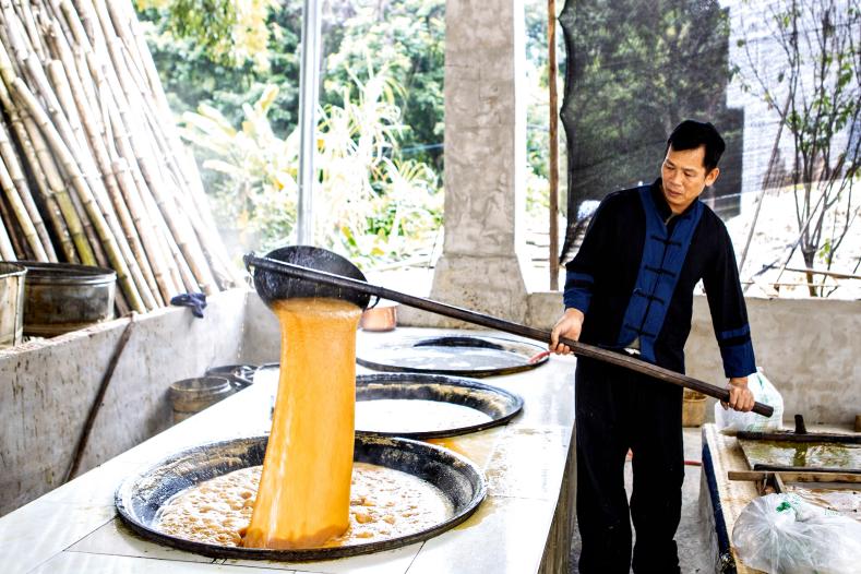 宁明县以文旅产业蓬勃发展、转型升级为契机,建设香料厂、红糖作坊等十大农产品加工厂,搭建非遗传播平台暨就业工坊,培养非遗传承新人。围绕文化与旅游深度融合发展主线,将花山壮拳、左江壮族民歌等非遗项目搬上骆越文化宫舞台,实现旅游效益与非遗传承的互益互补。鼓励和扶持当地村屯原居民围绕“花山”品牌开发茶壶、灯笼、扇子等衍生文创产品,带动群众增收。