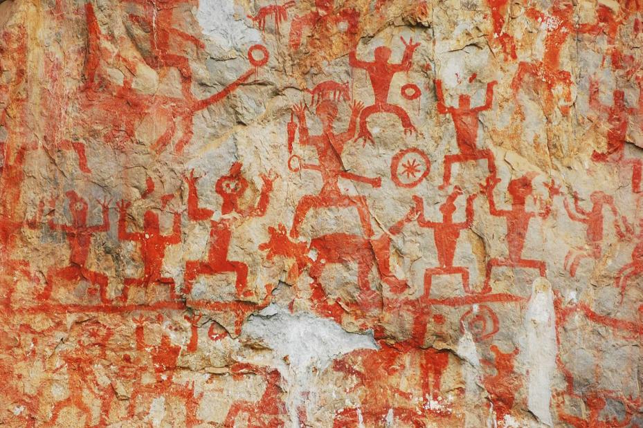 新华网南宁6月10日电 悠悠左江发源于十万大山,其主要支流明江蜿蜒于岩溶峰林之中。在广西崇左市宁明县城西北约25公里的明江东岸,崖壁如斧劈刀削,两千年前生息繁衍于此的古骆越人将造型各异的赭红色图像绘制于上,这便是颇具神秘色彩的花山岩画,民间称之为“小红人”。