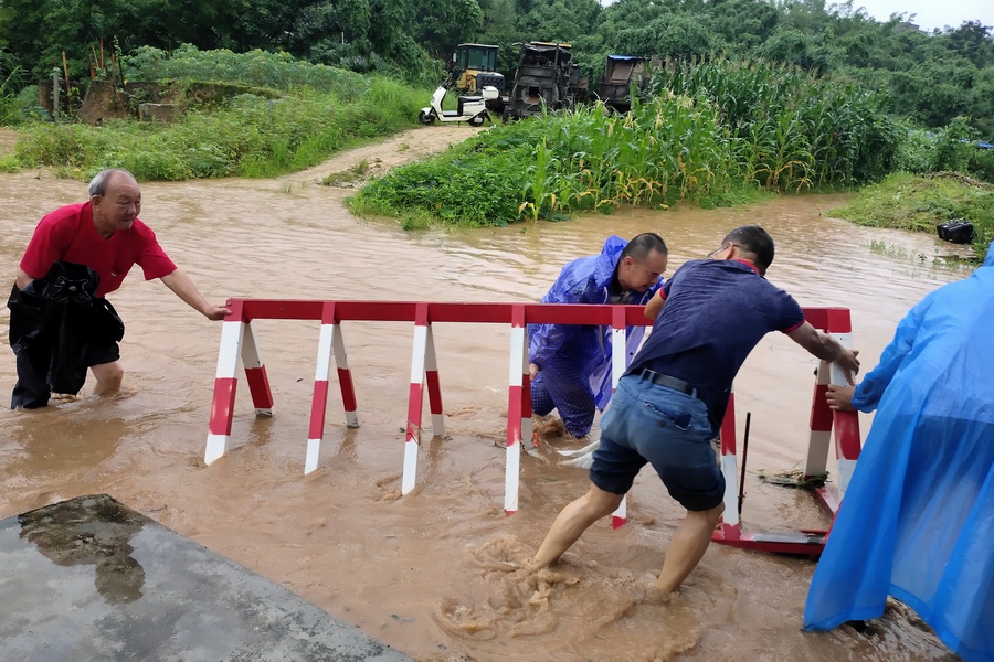 玉林市容县石头镇登州村河水漫过路面,当地党员干部群众合力设置警戒线。梁文梅 摄