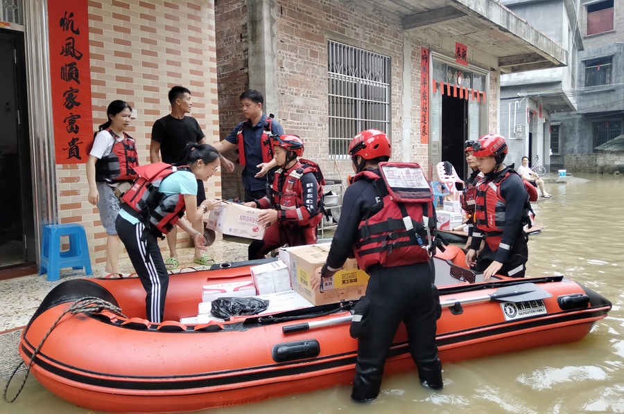 玉林市玉州区南江街道云良村驻村工作队员与消防救援人员为受灾群众运送物资。 陈璐 摄