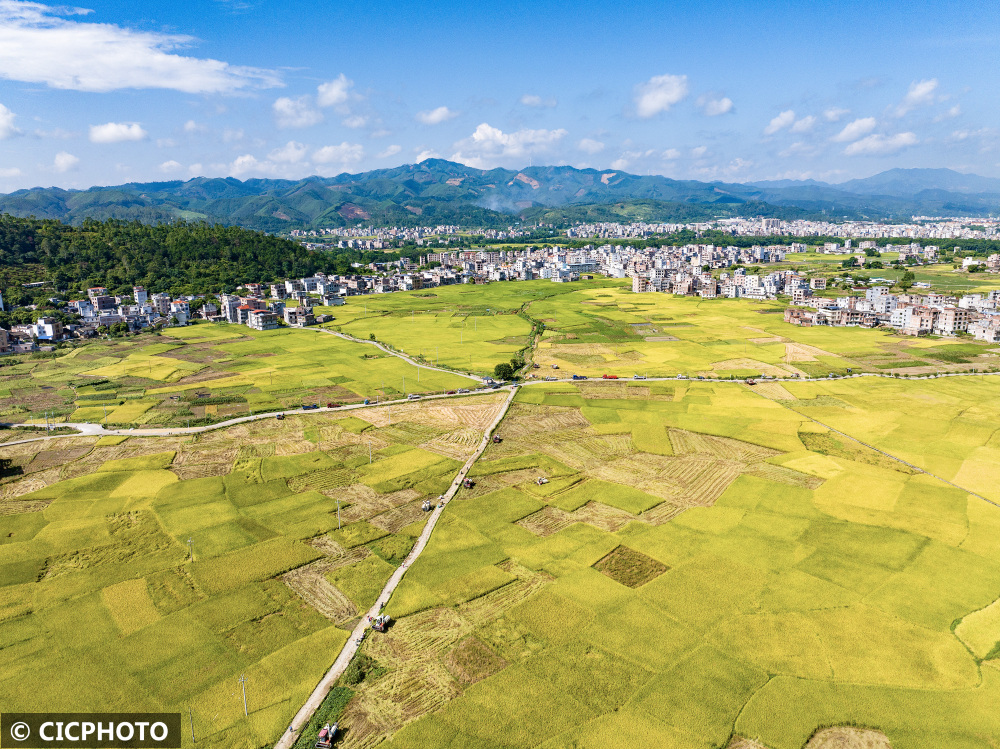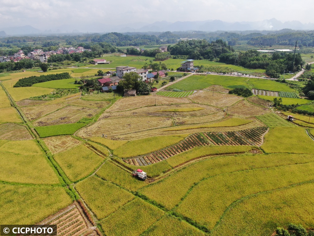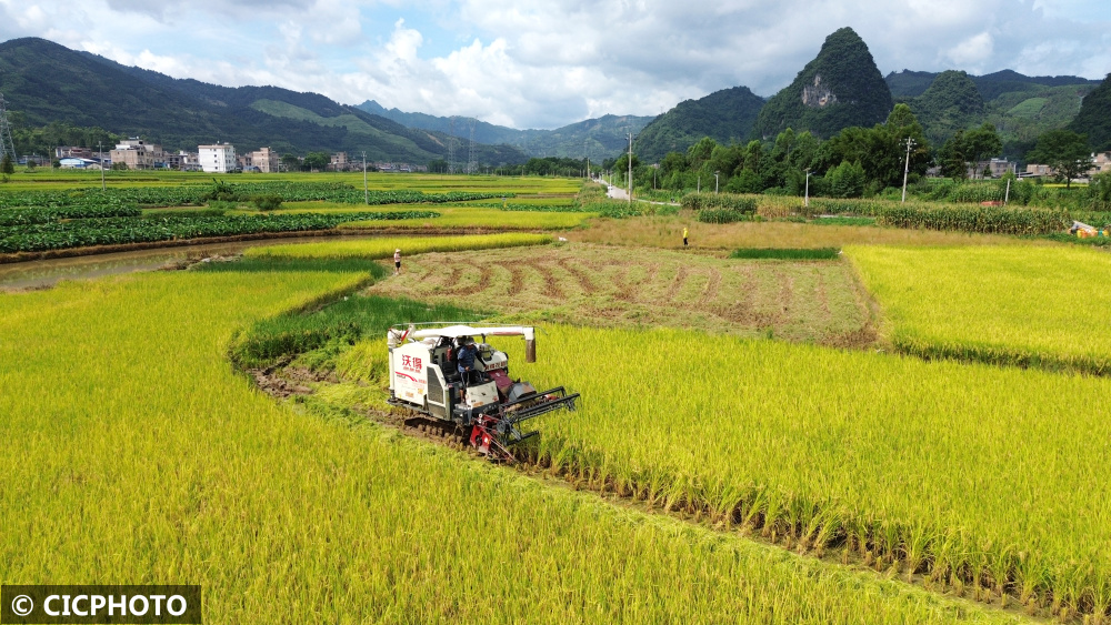 2024年7月11日,广西贺州市平桂区鹅塘镇芦岗村,农机手驾驶收割机收割早稻。(无人机照片)CICPHOTO/廖祖平 摄