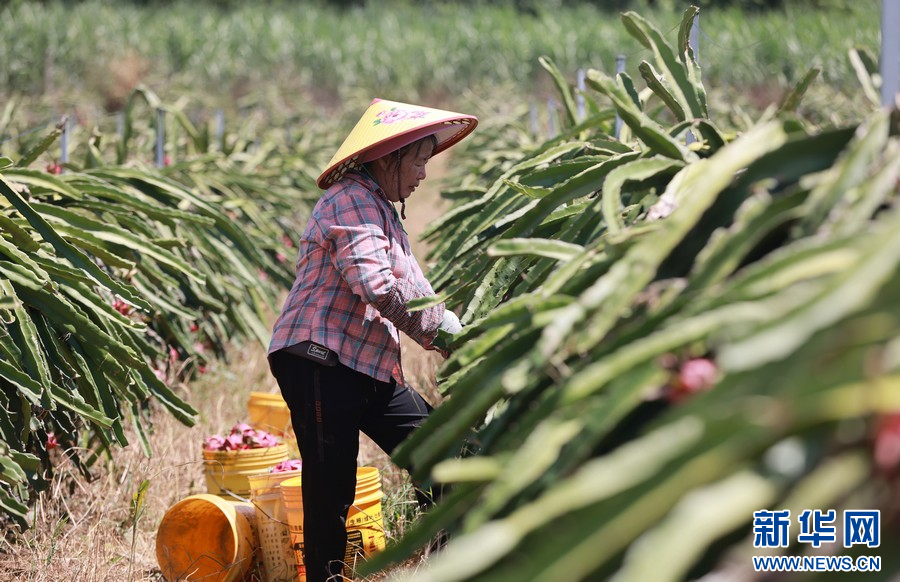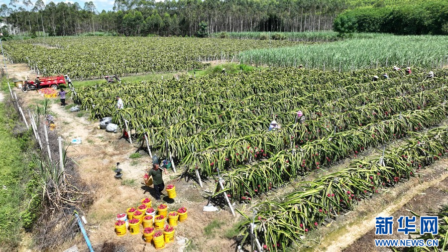夏季,在广西柳州市柳城县东泉镇雷塘村的一个家庭农场里,农户种植的软枝红心火龙果犹如一个个“小灯笼”挂满枝头,迎来了丰收的时刻。