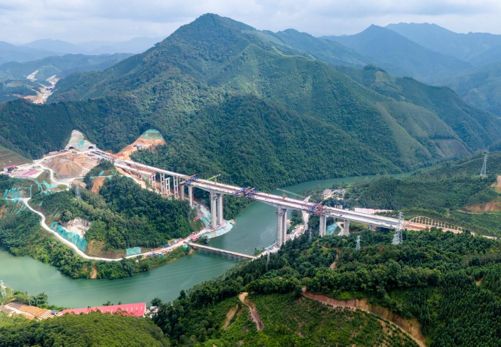 以上照片:2024年9月26日拍摄的广东清远连山至广西贺州高速公路项目黄洞大宁河大桥建设现场。(无人机照片)CICPHOTO/黎豪图 摄