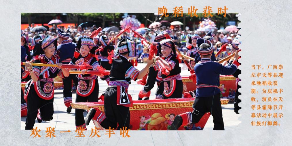 当下,广西崇左市天等县迎来晚稻收获期,到处是一派丰收景象。人们在此期间举办传统的霜降节,欢聚一堂庆祝丰收。
