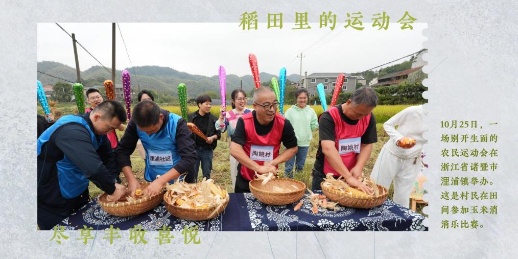 10月25日,一场别开生面的农民运动会在浙江省诸暨市浬浦镇举办,村民在金色的稻田间进行割稻、拔河、玉米消消乐等比赛,尽享丰收喜悦。