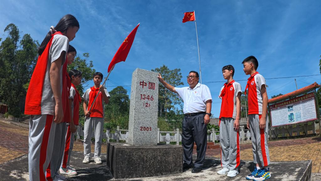 廖远彬给护界碑小分队讲述学校护界碑的历史和意义。(防城区融媒体中心供图)
