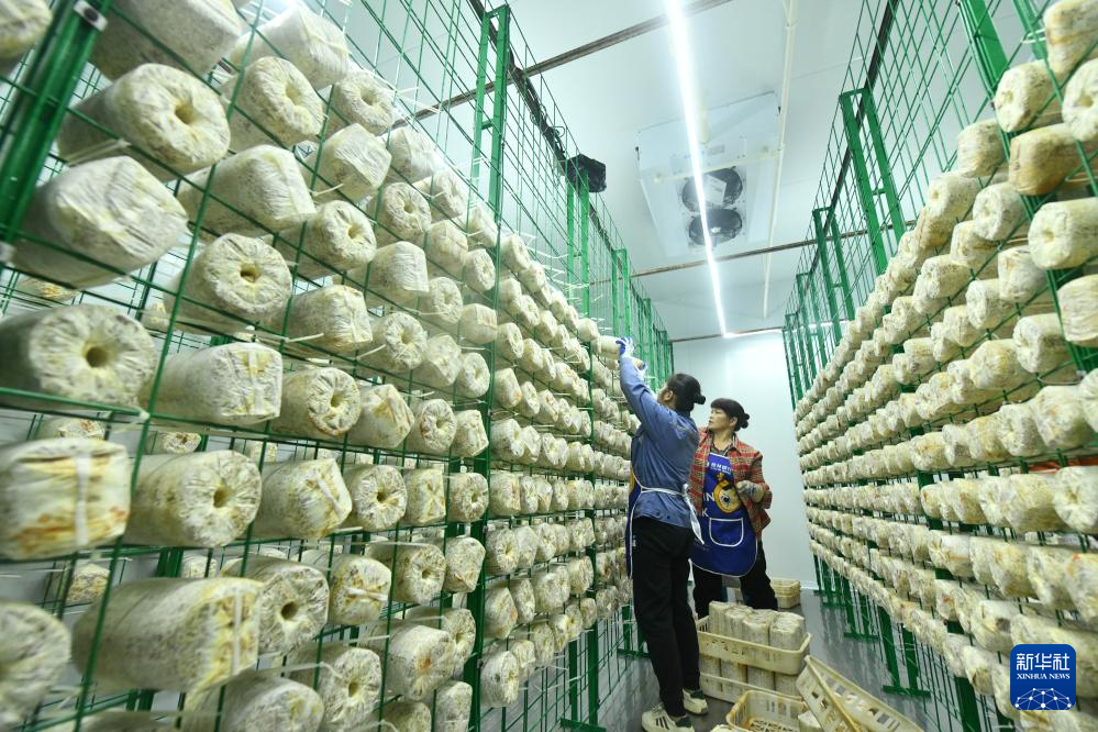 在广西百色市德保县城关镇那造村食用菌生产基地,村民在智能小方舱里采摘蘑菇(10月31日摄)。