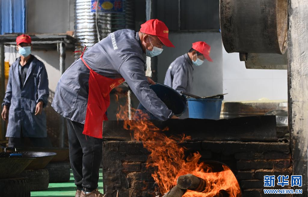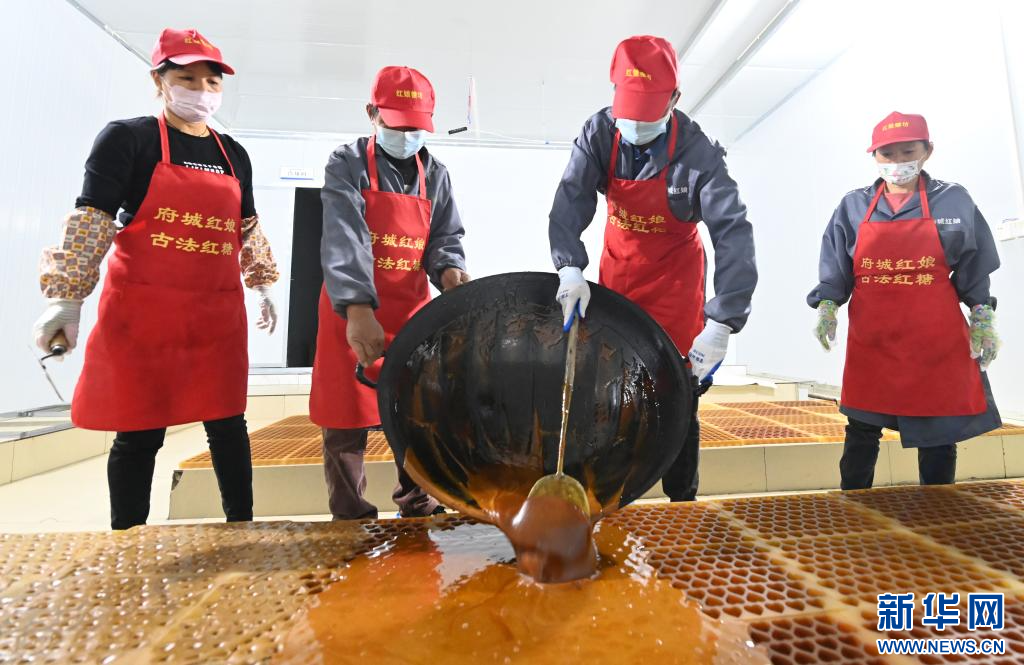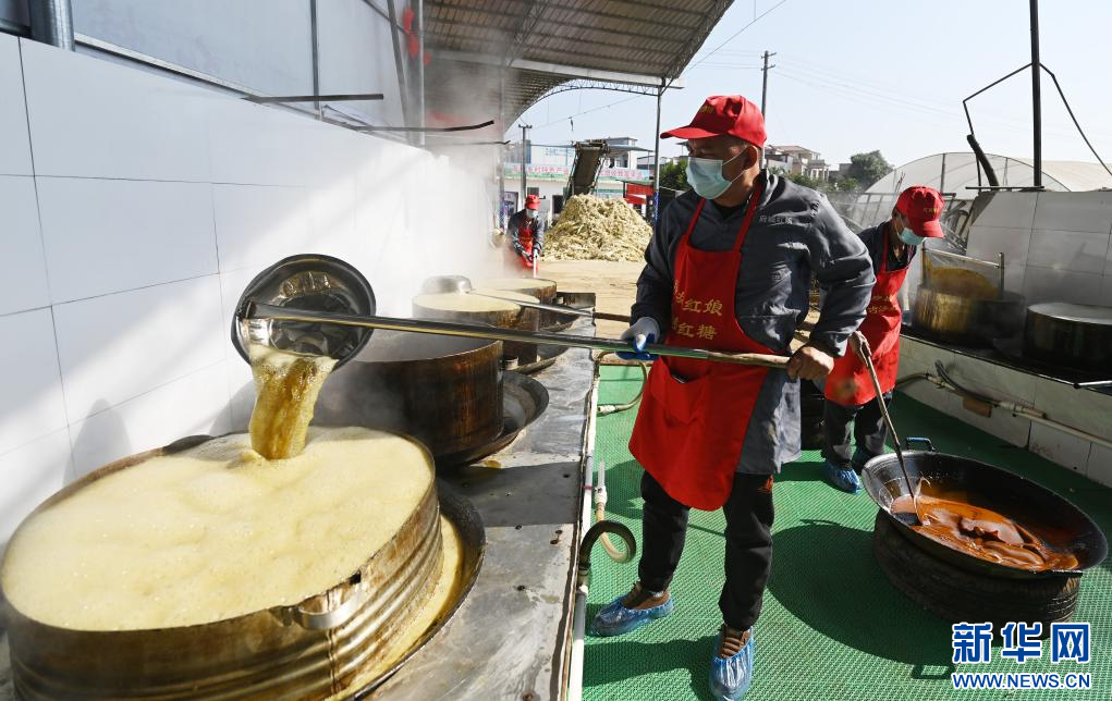 当日,广西南宁市武鸣区府城镇富良村定旺屯村民们加紧赶制红糖,供应即将到来的春节年货市场。