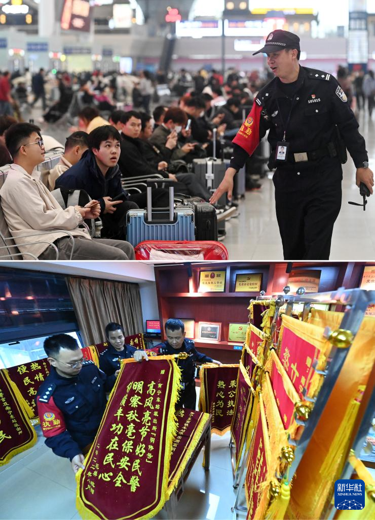 拼版照片。上图:在广西南宁东站,南宁铁路公安局南宁公安处南宁东站派出所民警高明伟在提醒旅客注意随身物品安全;下图:高明伟(右)在南宁东站和同事一起整理旅客送来的锦旗(2024年1月9日摄)。高明伟在日常工作中坚持做一件“小事”——帮旅客寻找遗失物品。