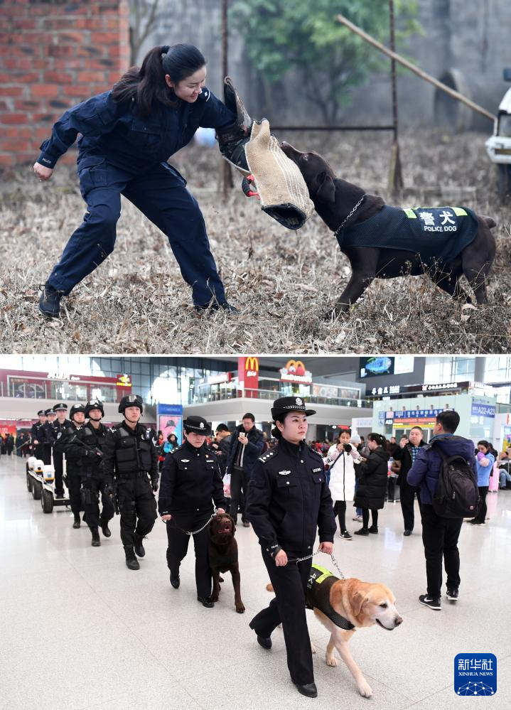 拼版照片。上图:在南宁铁路公安局南宁公安处警犬工作队,民警黄晓莉带着警犬在训练(2019年1月25日摄);下图:黄晓莉(前)带着警犬和同事在南宁东站巡逻,守护春运安全(2019年1月21日摄)。