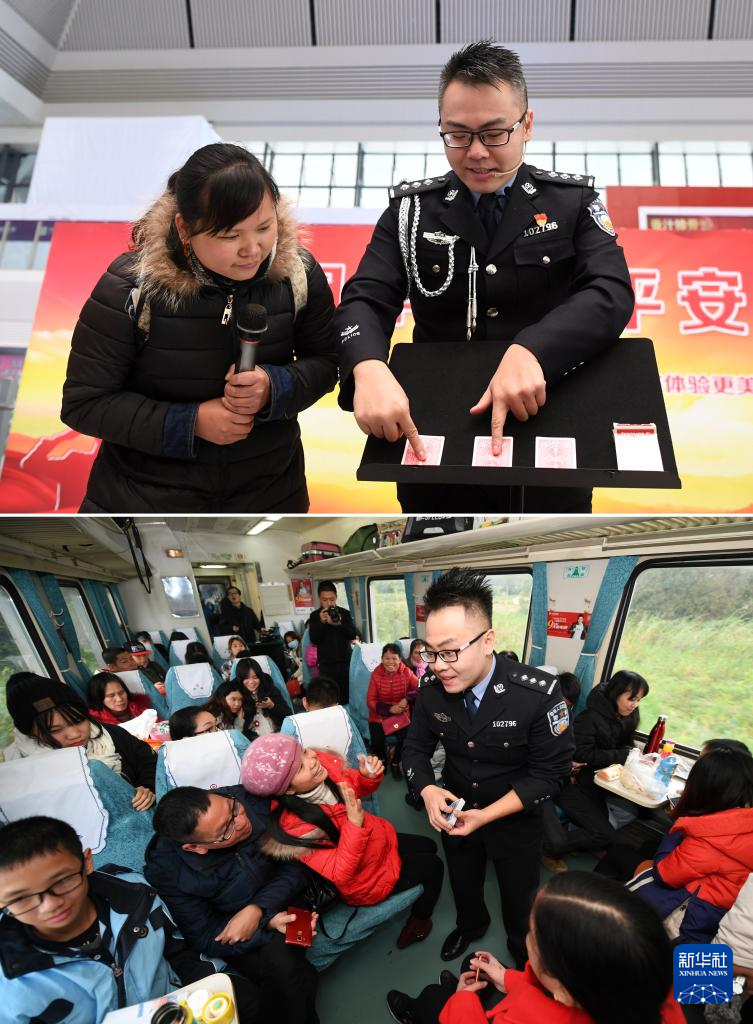 拼版照片。上图:在广西南宁东站,南宁铁路公安局南宁公安处民警秦国平(右)通过魔术向旅客传授反诈防骗知识(2018年2月1日摄);下图:在广西凭祥市开往南宁市的列车上,秦国平通过魔术向旅客传授反诈防骗知识(2019年1月1日摄)。