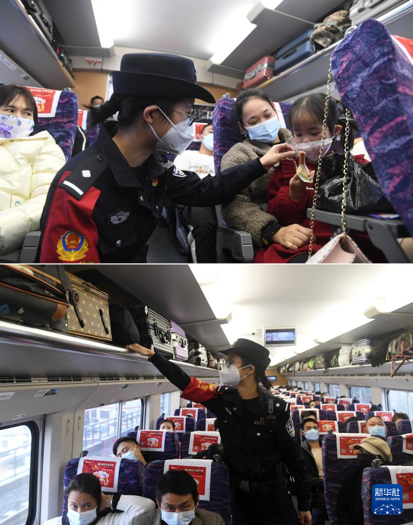 拼版照片。上图:在广西北海开往云南大理的D3956次动车上,南宁铁路公安局南宁公安处民警杨柳臻在和旅客交流;下图:杨柳臻在列车上检查旅客行李是否放置好(2022年1月17日)。