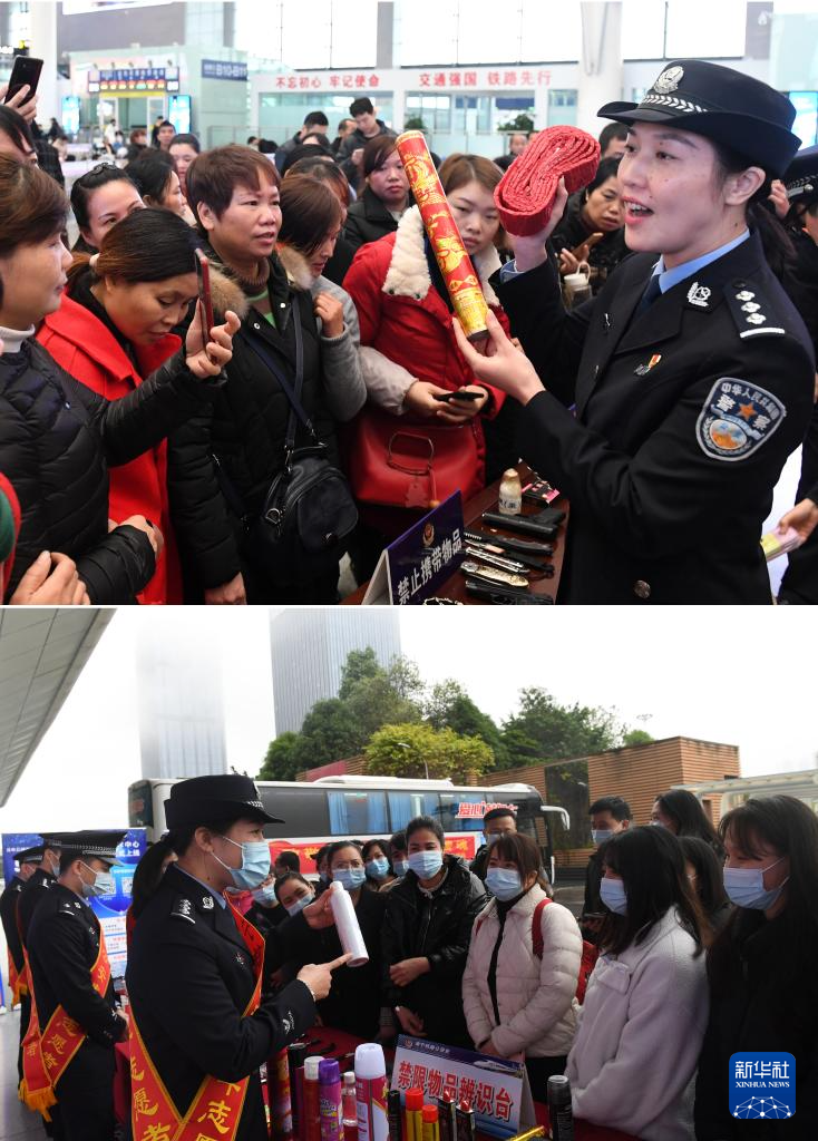 拼版照片。在南宁东站,南宁铁路公安局南宁公安处民警王瑜在向旅客展示列车禁止携带的物品,讲解乘车安全知识(上图 2019年1月10日摄,下图 2022年1月9日摄)。