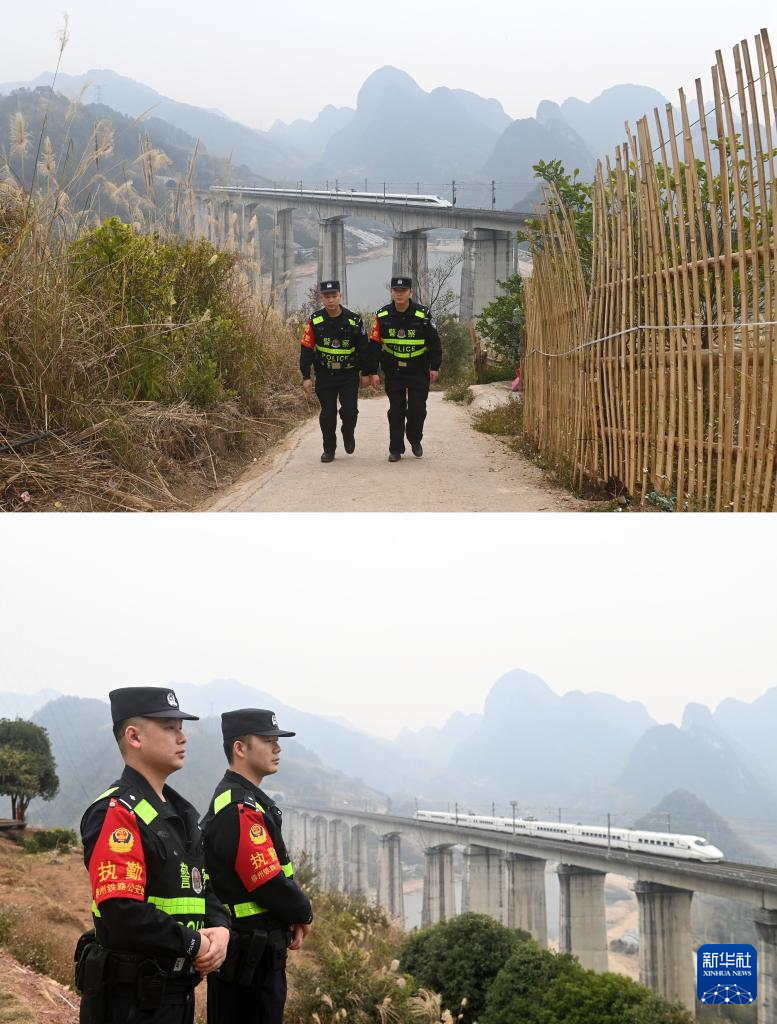 拼版照片。上图:在广西阳朔县境内,南宁铁路公安局柳州公安处阳朔站派出所民警陈学强(左)和王允走在巡逻路上;下图:陈学强(左)和王允在守护列车通过一座桥梁(2025年1月8日摄)。