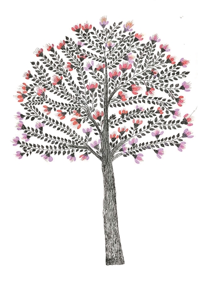 多年来,老人先后创作了千余幅画作,画中的花草树木形态各异、色彩鲜艳,在星星点点的绽放中,闪烁着跃然纸上的鲜活。遇到印象深刻的事物,老人不惜用几幅画反复再现,比如堂屋前那棵木棉树。画中的木棉枝繁叶茂、飞鸟栖息,树下鸡犬相戏、绿草如茵。
