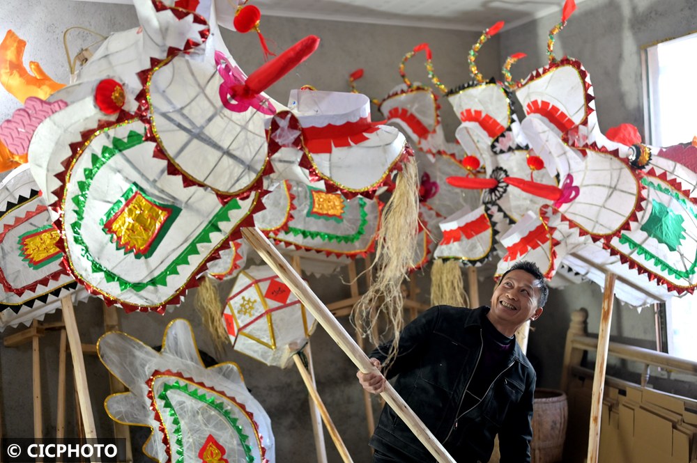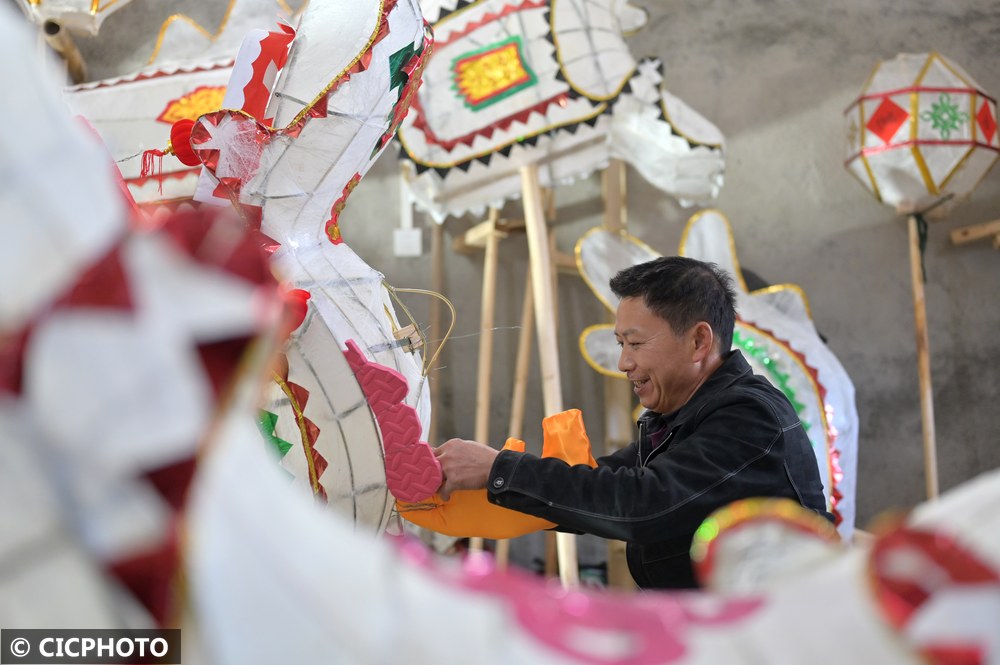 ↑2025年1月12日,湖南省娄底市双峰县杏子铺镇泉坝村的手艺人在查看扎制好的火龙灯。CICPHOTO/李建新 摄