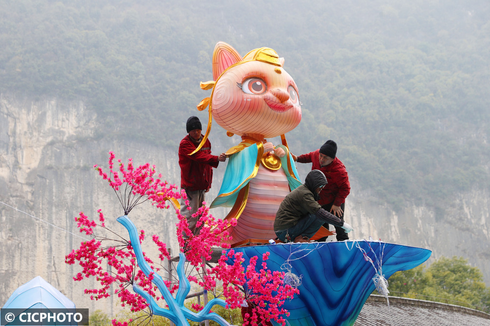 ↑2025年1月7日,工人在重庆市黔江区城市大峡谷景区安装花灯。CICPHOTO/杨敏 摄