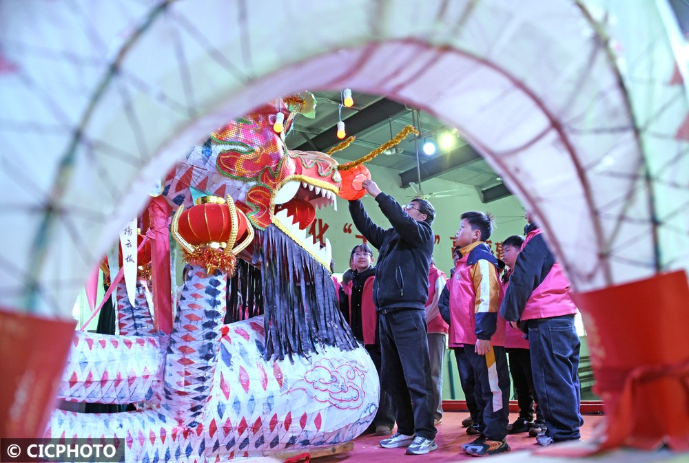↑2025年1月12日,浙江省台州市仙居县横溪镇中心小学学生在曹店村文化礼堂观看当地民间艺人制作板凳龙灯。CICPHOTO/王华斌 摄