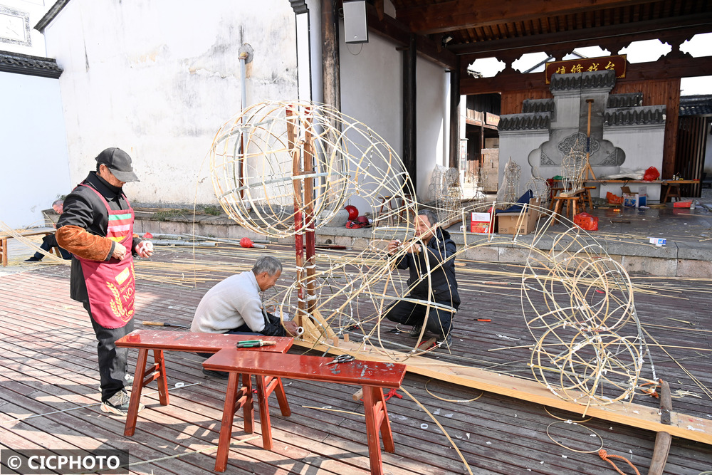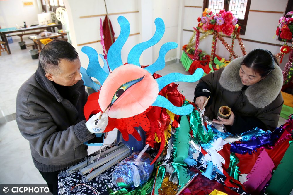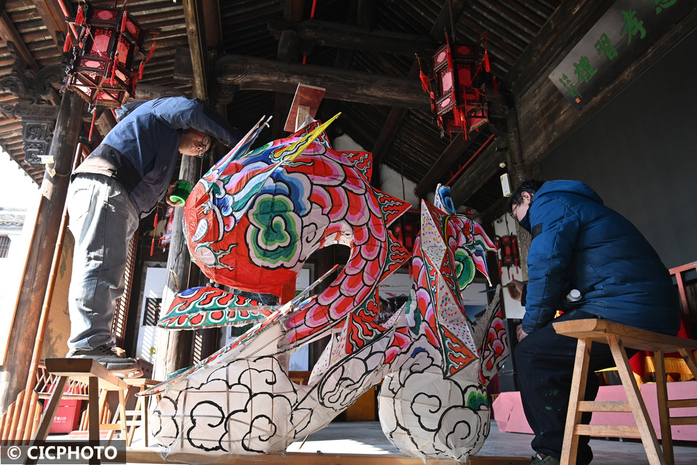↑2025年1月2日,一家灯艺工作室的工作人员在浙江省东阳市卢宅景区制作龙灯。CICPHOTO/包康轩 摄