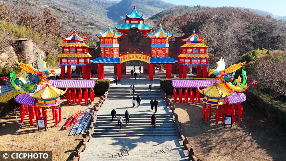 ↑2025年1月16日,工作人员在江苏省连云港市花果山景区组装西游灯会主题花灯。(无人机照片)CICPHOTO/耿玉和 摄