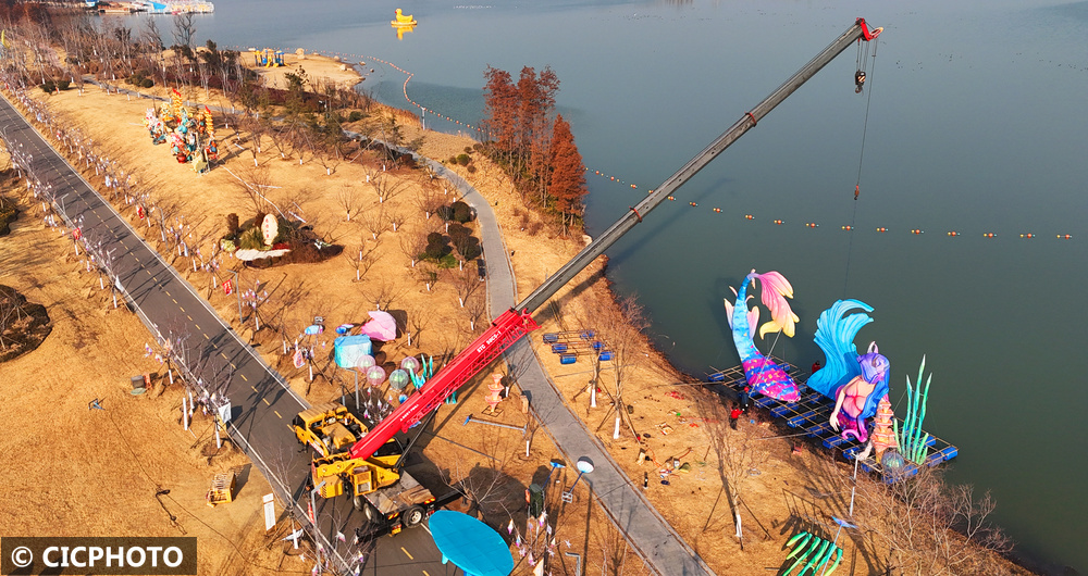 ↑2025年1月6日,工匠在江苏省连云港市海州区月牙岛景区安装花灯。(无人机照片)CICPHOTO/耿玉和 摄