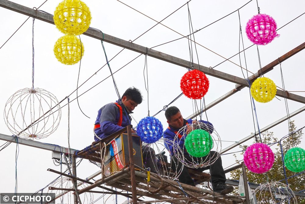 ↑2025年1月7日,工人在广西南宁市青秀山景区安装花灯。CICPHOTO/喻湘泉 摄