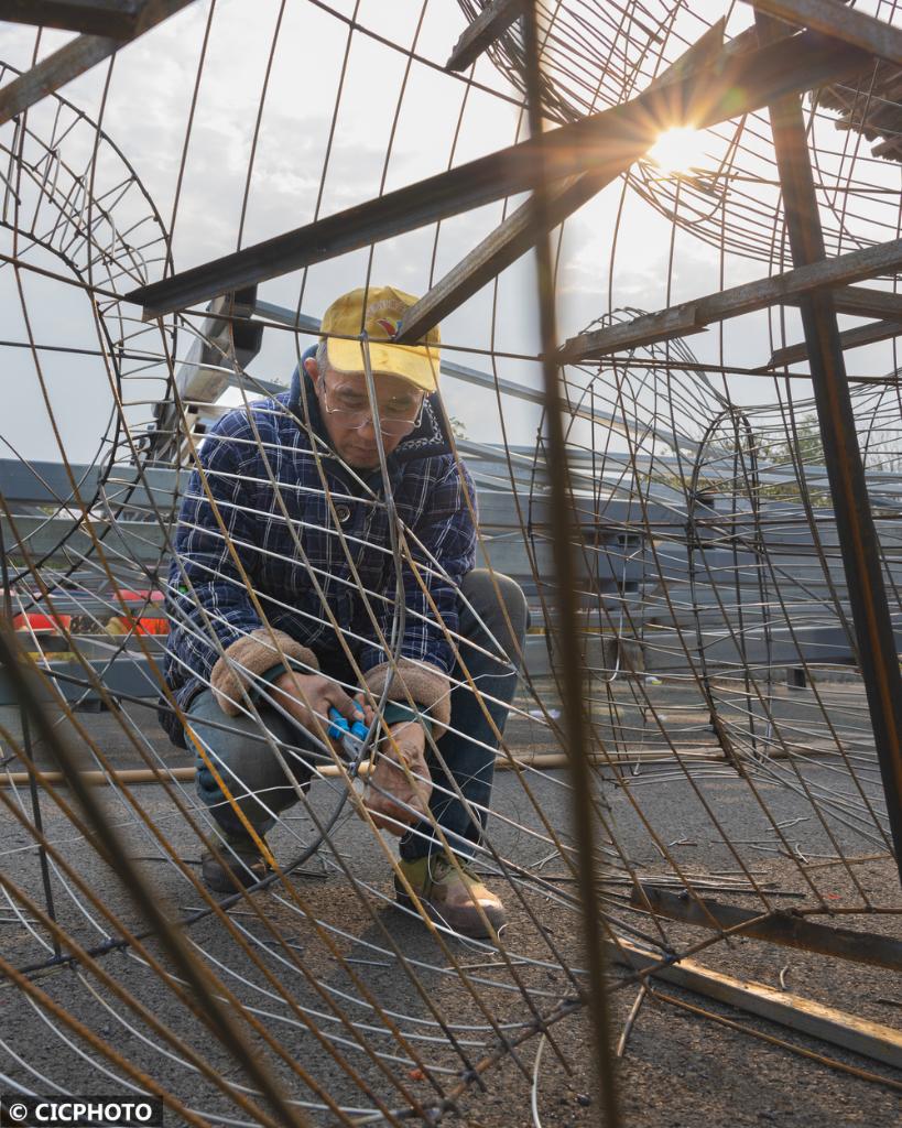 ↑2025年1月16日,民间艺人在河南省南阳市世界月季大观园制作、安装花灯。CICPHOTO/高嵩 摄