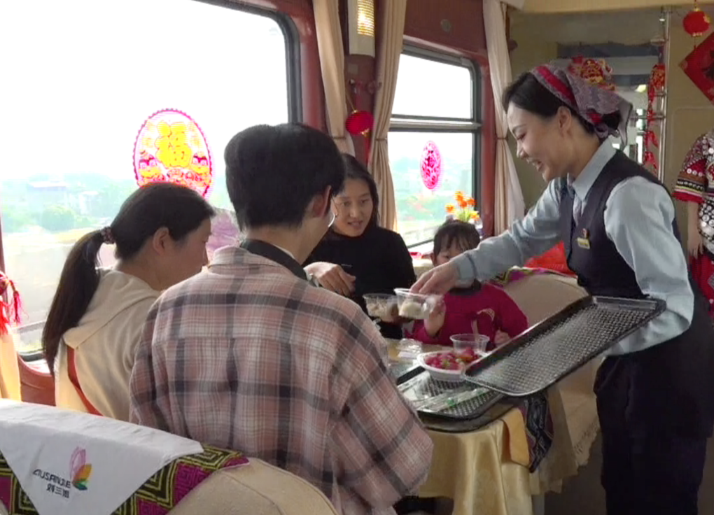 不到10分钟,餐车上的“观众席”便满座了,席间有“三代同堂”的家庭游客,也有结伴回乡的工友、同学,男女老少的脸上都洋溢着笑容。“我们的‘春晚’,像往年一样反响热烈!”列车员、“春晚”主持人刘欣自豪地说。