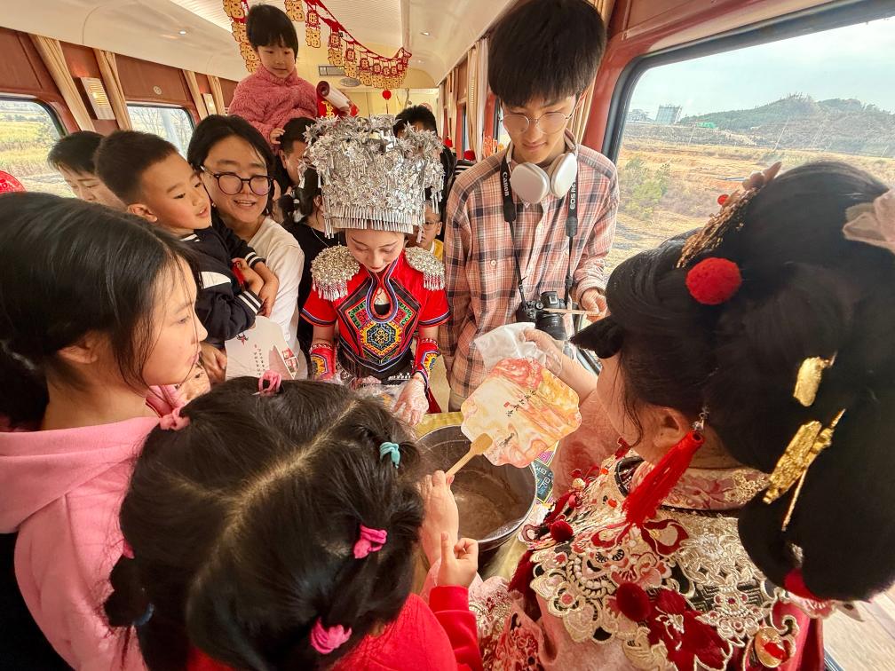 历年来“列车春晚”的舞台都设在餐车。挂上各式红色的喜庆饰品,餐车被装点得年味十足。一切就绪后,工作人员贴心地向车上旅客发布活动预告:“11点半我们将在餐车举办‘列车春晚’,有精彩演出,还有非遗手工体验、年味美食品尝,欢迎大家来参加……”