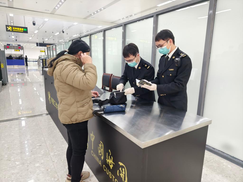 图为硕龙海关关员对通关旅客证件和行李物品进行检查。马成浩摄