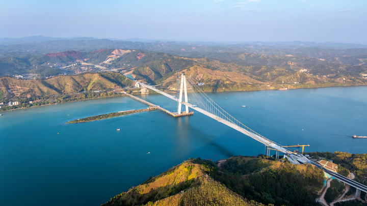 藤州浔江大桥位于广西壮族自治区梧州市藤县,全长1604米,主跨采用2×638米全漂浮体系钢箱梁,主塔为“三角塔”造型,塔高238米,是广西境内最高桥塔。