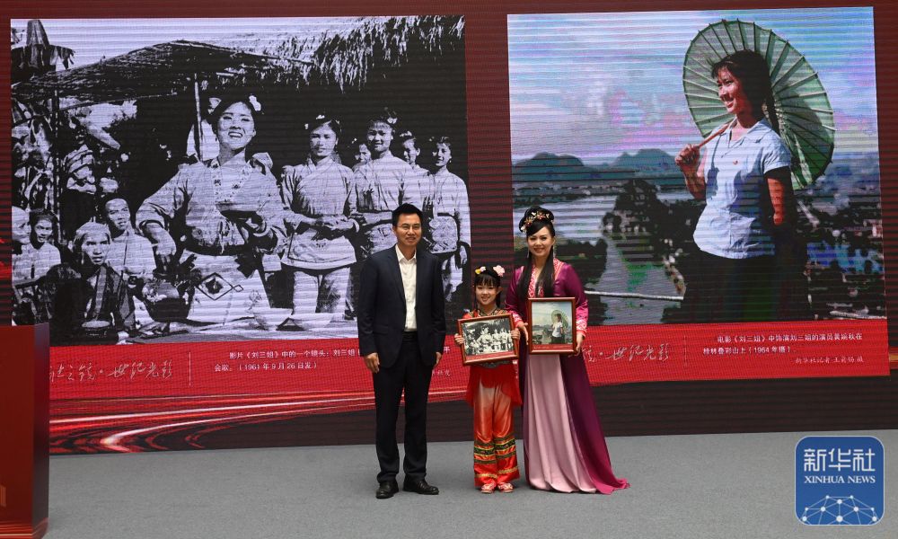 ↑新华社广西分社社长、分党组书记段羡菊(左)向“刘三姐”扮演者黄婉秋的女儿和外孙女赠送老照片。新华社记者 陆波岸 摄