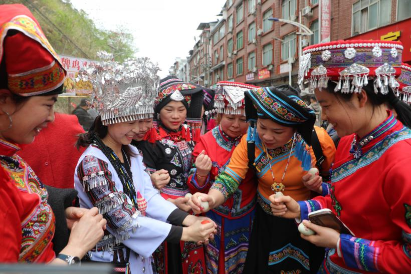 3月31日是农历三月初三,大化瑶族自治县岩滩镇举行“碰蛋”民俗活动。
