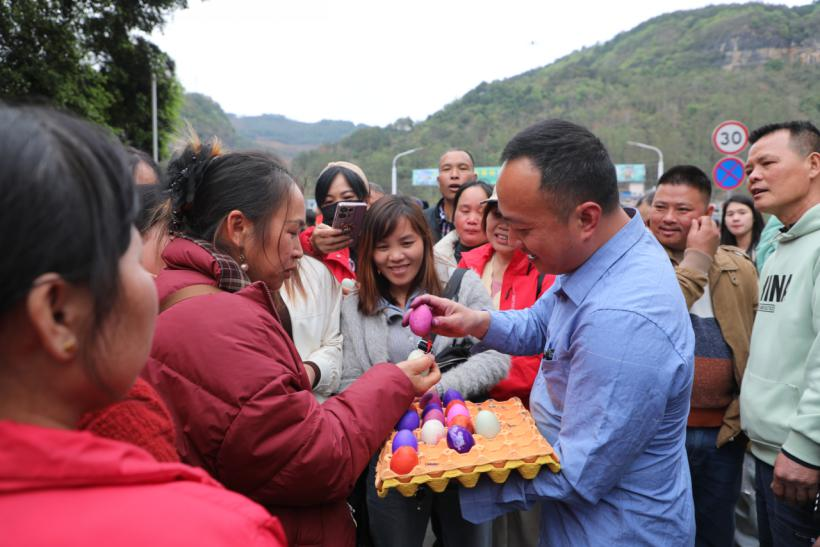 每逢“三月三”,岩滩镇群众身着盛装,带上染成彩色的鸡蛋、鸭蛋,聚集于岩滩大桥两头对山歌、碰彩蛋。大家你来我往,以蛋相碰传递祝福,寓意“破壳迎新、碰出好运”。(陆荣斌 唐毓春 梁耀)