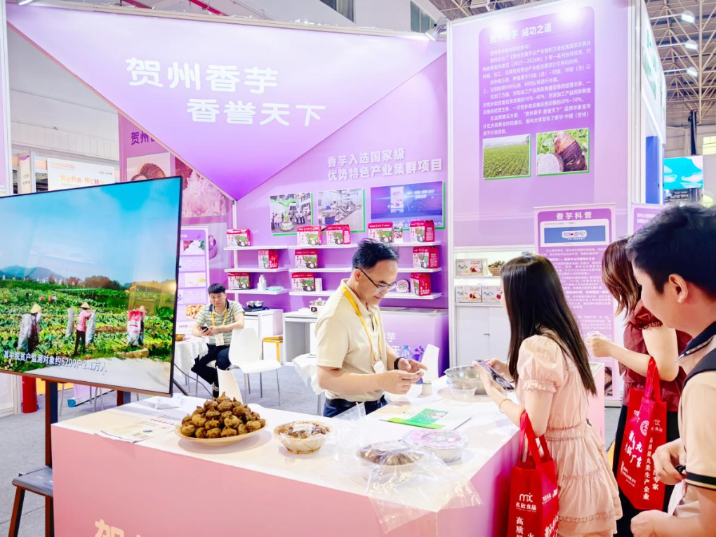 在食博会—预博会现场,紫色主题设计成为广西贺州香芋展台的独特亮点,简洁明快的空间布局营造出强烈的视觉吸引力。展柜上,传统美食区的香芋扣肉、香芋排骨、新潮饮品区的芋圆、芋泥奶茶以及烘焙零食区的芋头酥、芋头芋圆等,共同组成了这个以香芋为原料的“美食城”。展会期间,工作人员热情地向各方客商介绍香芋的科普知识、食用方法,以及贺州香芋独特的种植优势、工艺和市场发展前景,吸引了大量参展商与观众驻足体验。(蒋正阳)