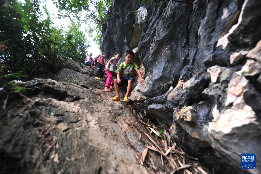 在广西大化瑶族自治县板升乡弄雷村哈宝屯,10岁的蒙富松(右一)爬悬崖去学校读书(2012年9月5日摄)。