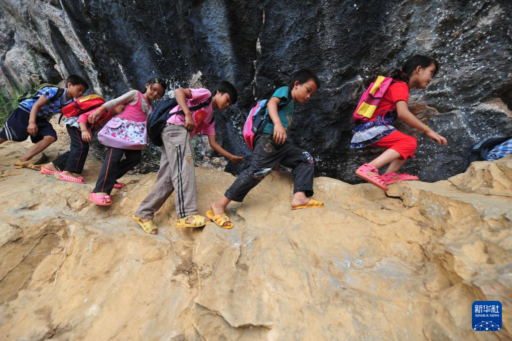 在广西大化瑶族自治县板升乡弄雷村哈宝屯,10岁的蒙富松(左一)爬悬崖去学校读书(2012年9月3日摄)。