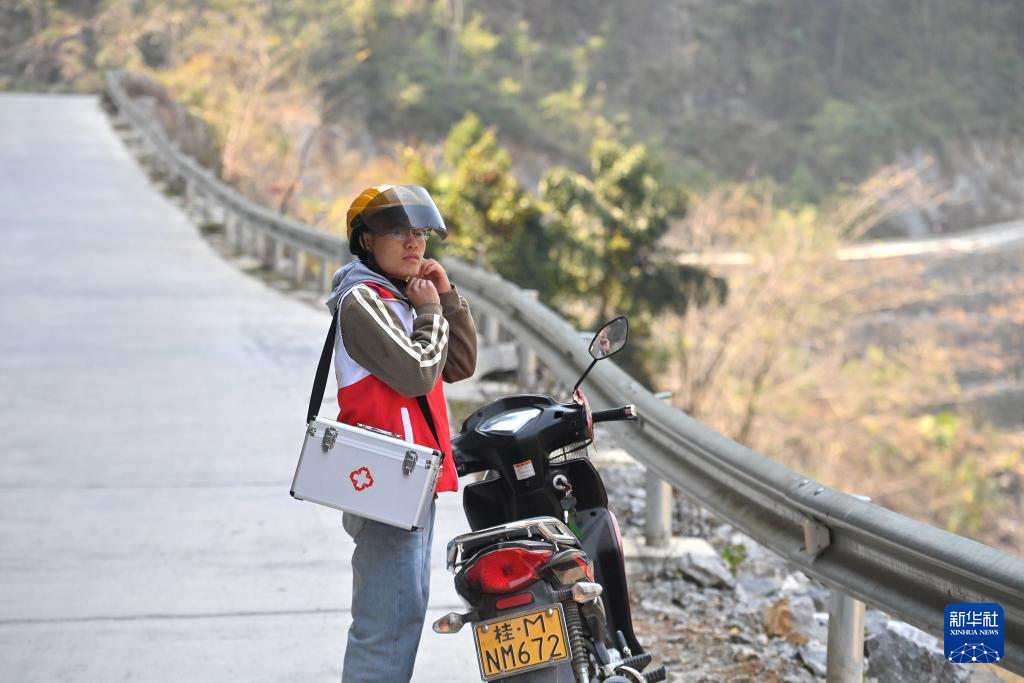 在广西大化瑶族自治县板升乡弄雷村,村医蒙富松准备进村入户给村民看病(2024年3月6日摄)。