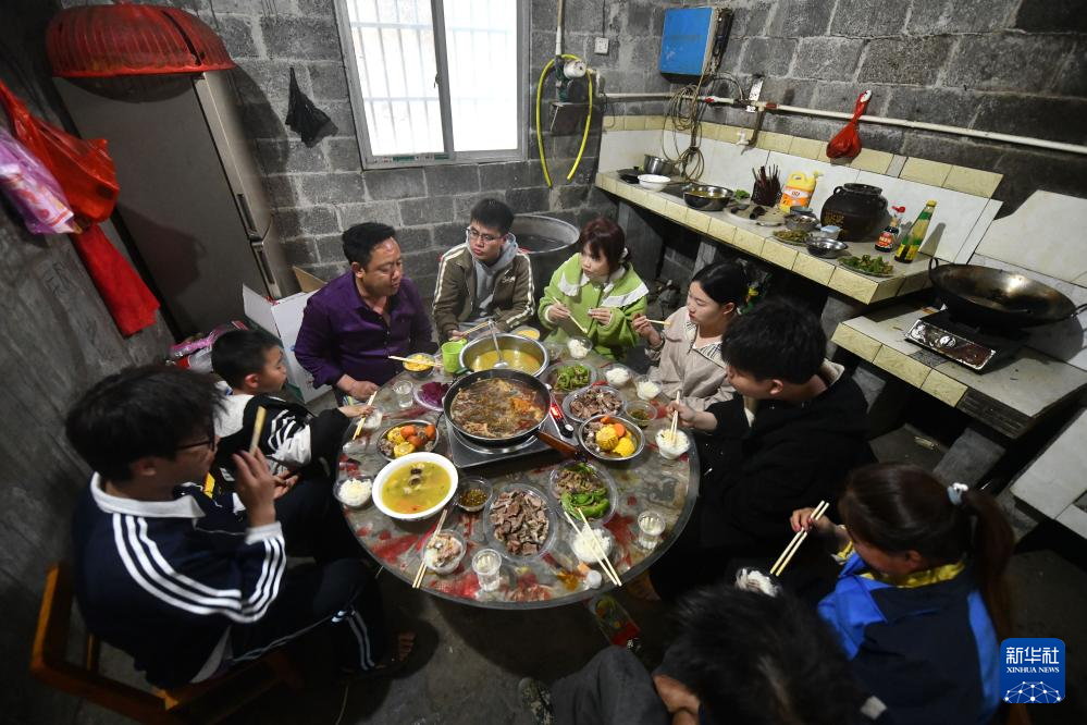 在广西大化瑶族自治县板升乡弄雷村,村医蒙富松(左四)和家人吃团圆饭(2025年1月20日摄)。