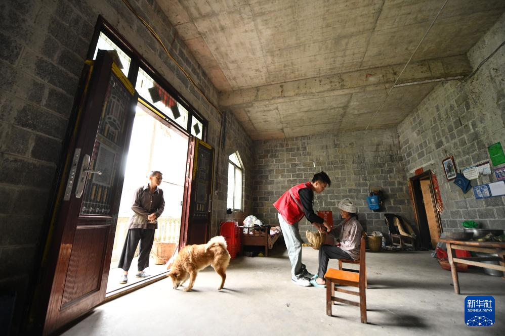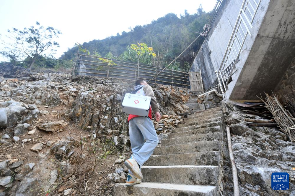 在广西大化瑶族自治县板升乡弄雷村,村医蒙富松进村入户给村民看病(2025年1月19日摄)。