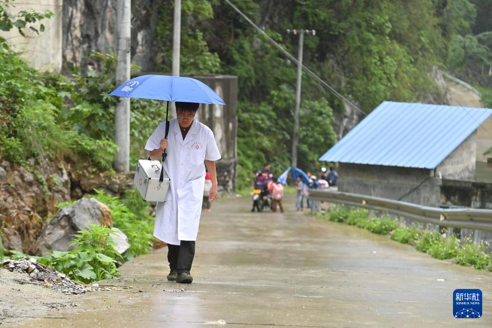 在广西大化瑶族自治县板升乡弄雷村,村医蒙富松走在村道上,准备进村入户给村民看病(2025年5月27日摄)。