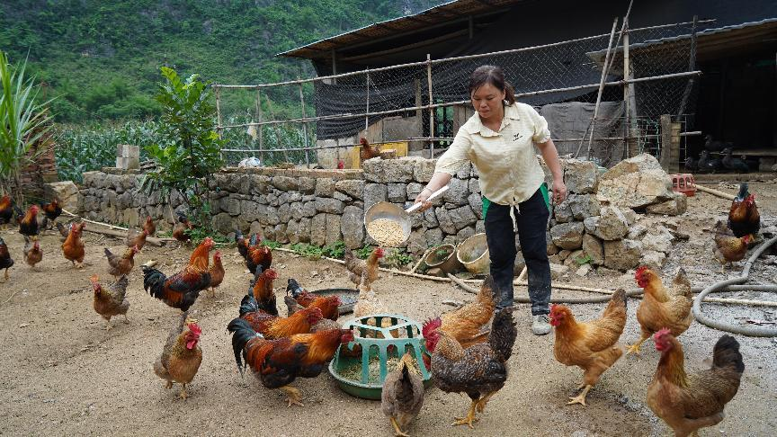 在大化县仁良村,村民蓝春香正在篱笆院里给自家养的土鸡喂食。她在自家房前屋后的庭院里养了50多只鸡、8头牛,4头猪,还种上了碧绿青翠的蔬菜和果树。“通过发展庭院经济,我一年能增收5万多元,又能照顾两个孩子。”蓝春香说。