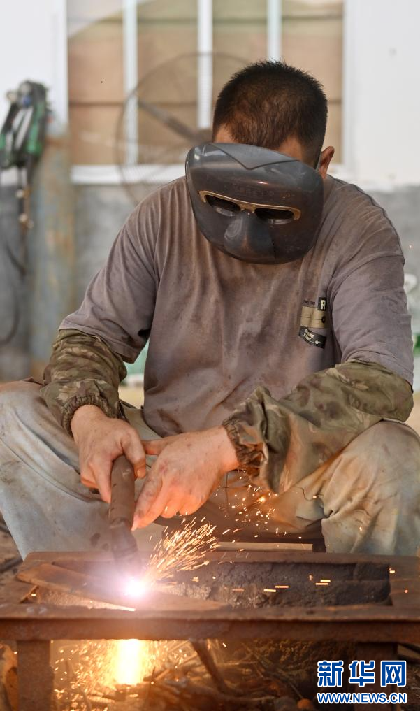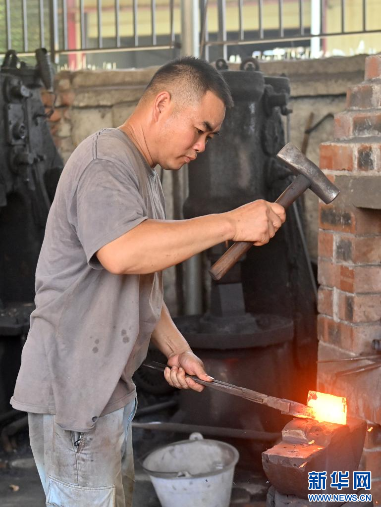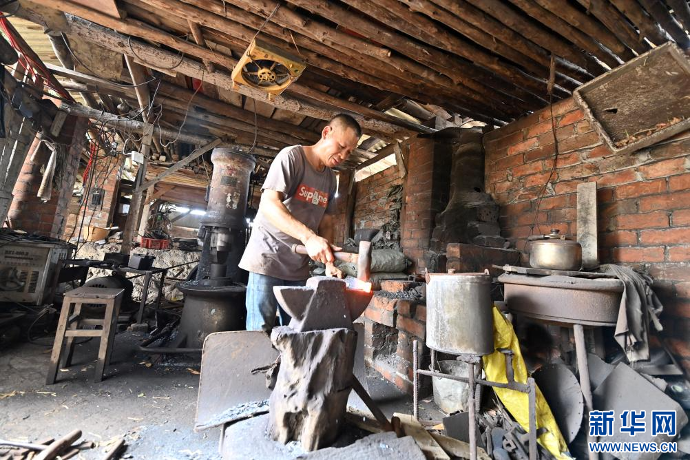 7月16日,广西隆安县雁江镇红良村,村民凌维军在自己的作坊里打制铁具。
