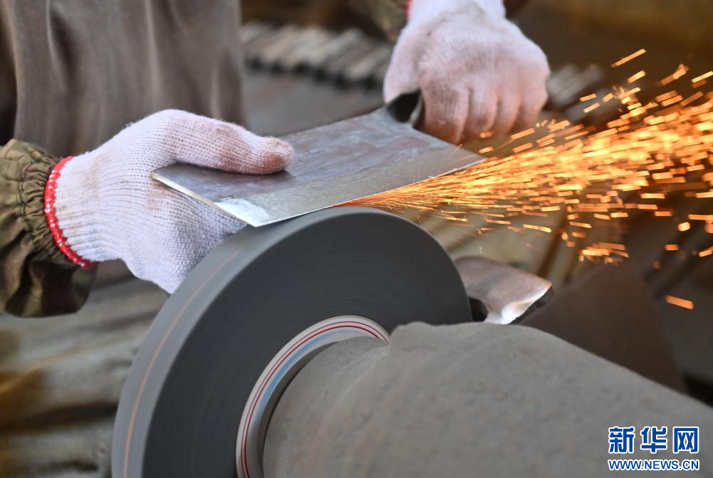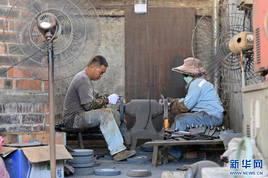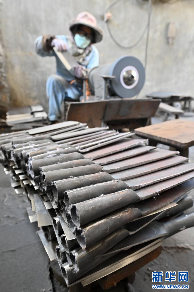 7月16日,广西隆安县雁江镇红良村,村民林玉珍在自己的作坊里打磨菜刀。