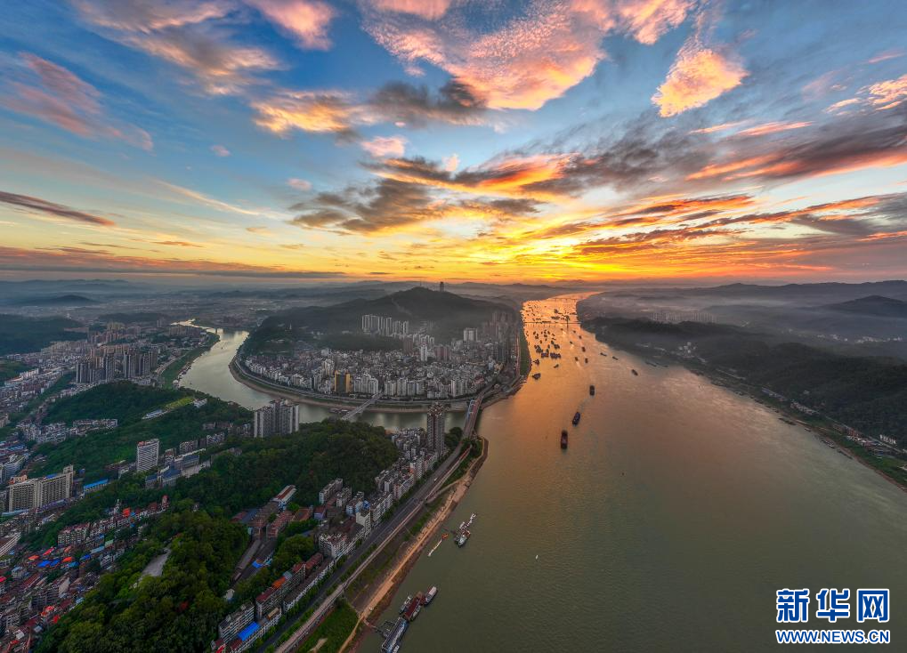9月16日清晨在广西梧州拍摄的西江水域朝霞(无人机照片)。