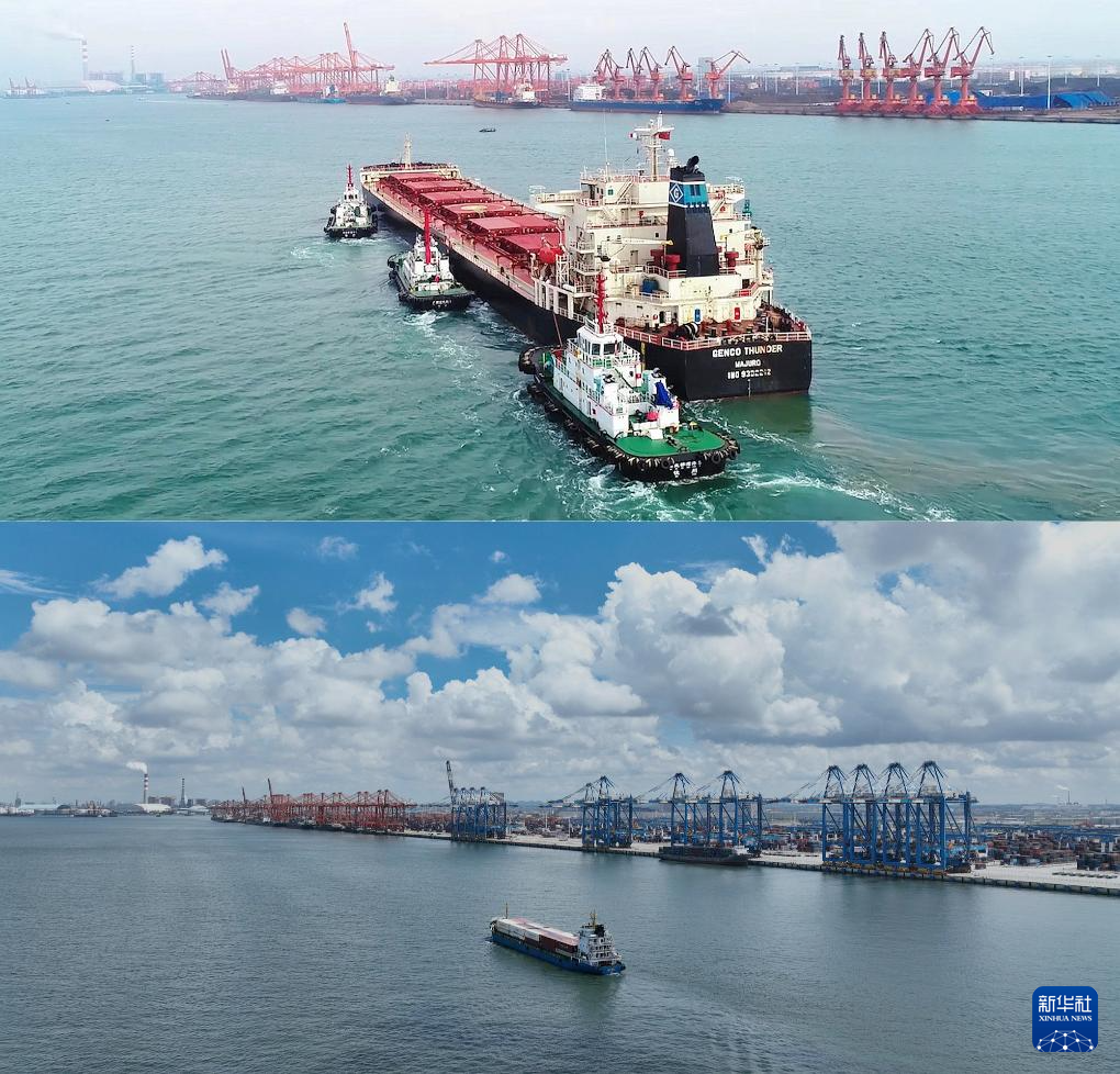 拼图照片:上图为2021年5月10日拍摄的钦州港,集装箱自动化码头尚未建设(无人机照片);下图为2023年11月24日拍摄的钦州港,集装箱自动化码头已投入运营(无人机照片)。
