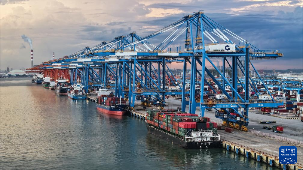 海轮在钦州港码头装卸货物(9月16日摄,无人机照片)。