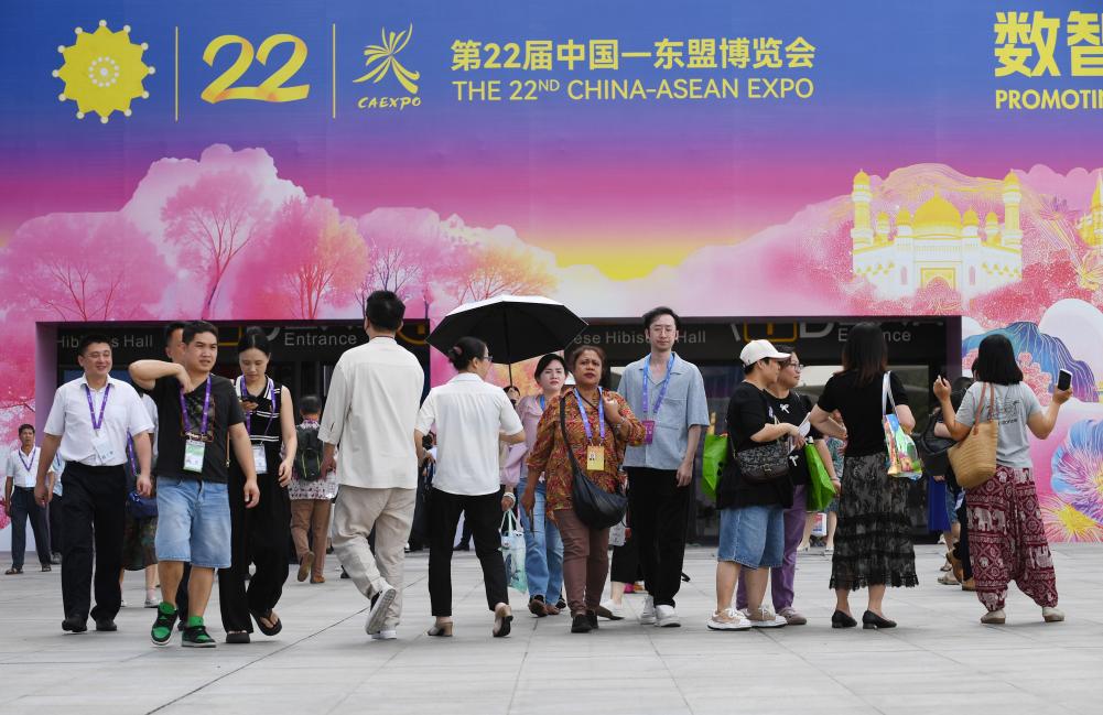 9月17日,在广西南宁国际会展中心,人们从展馆外走过。 新华社记者 陆波岸 摄