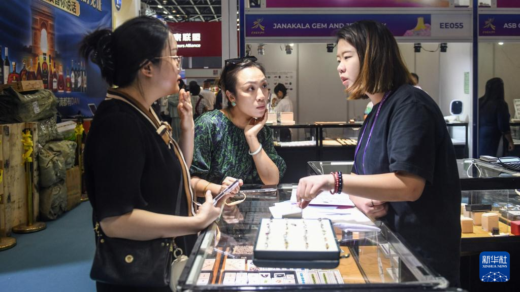 9月20日,在广西南宁国际会展中心斯里兰卡展馆,两位女士在选购钻戒。